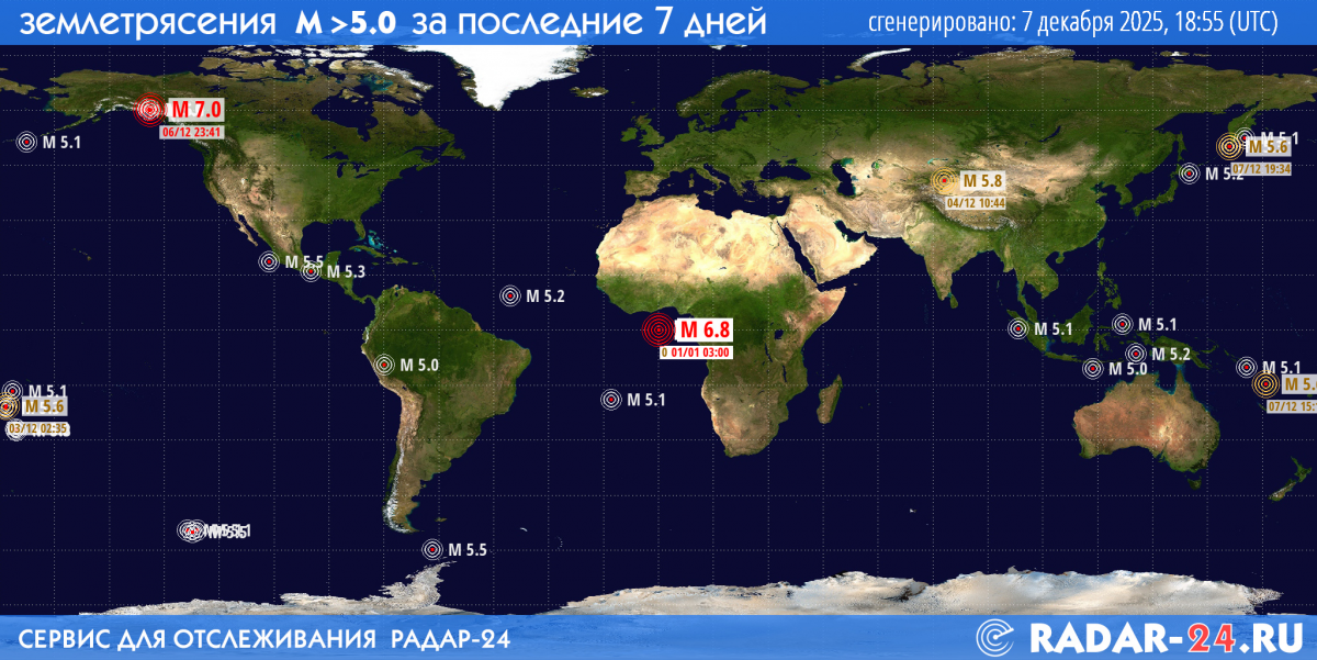 На карте сильные землетрясения за последние 24 часа, 7 декабря 2025 года