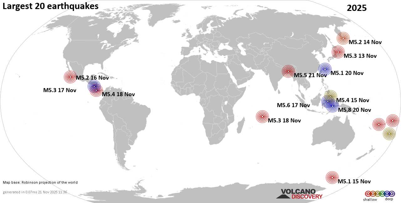 Землетрясения вчера на карте: сильные землетрясения, 20 ноября 2025 года