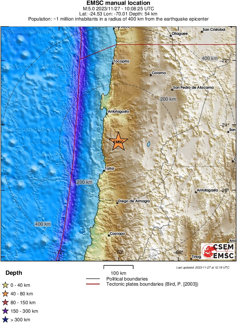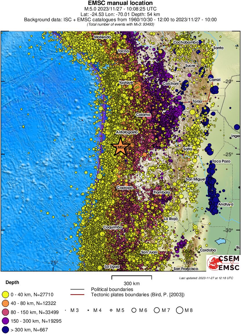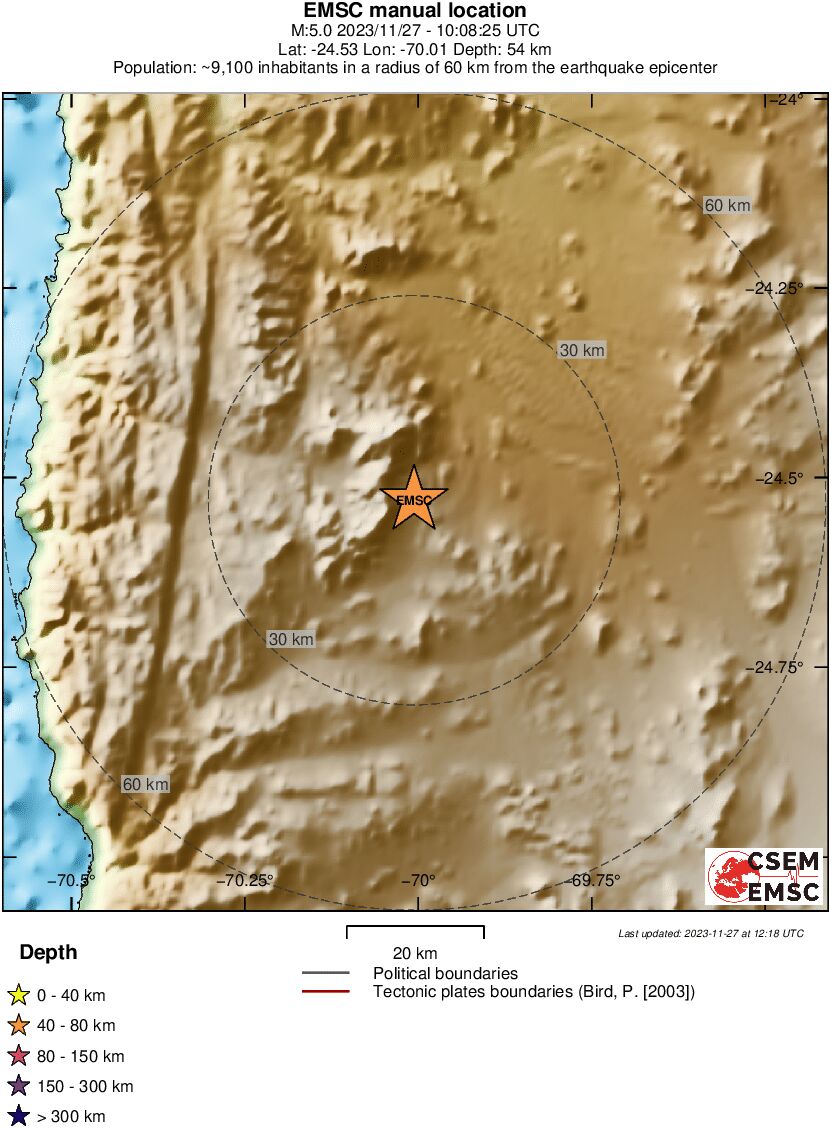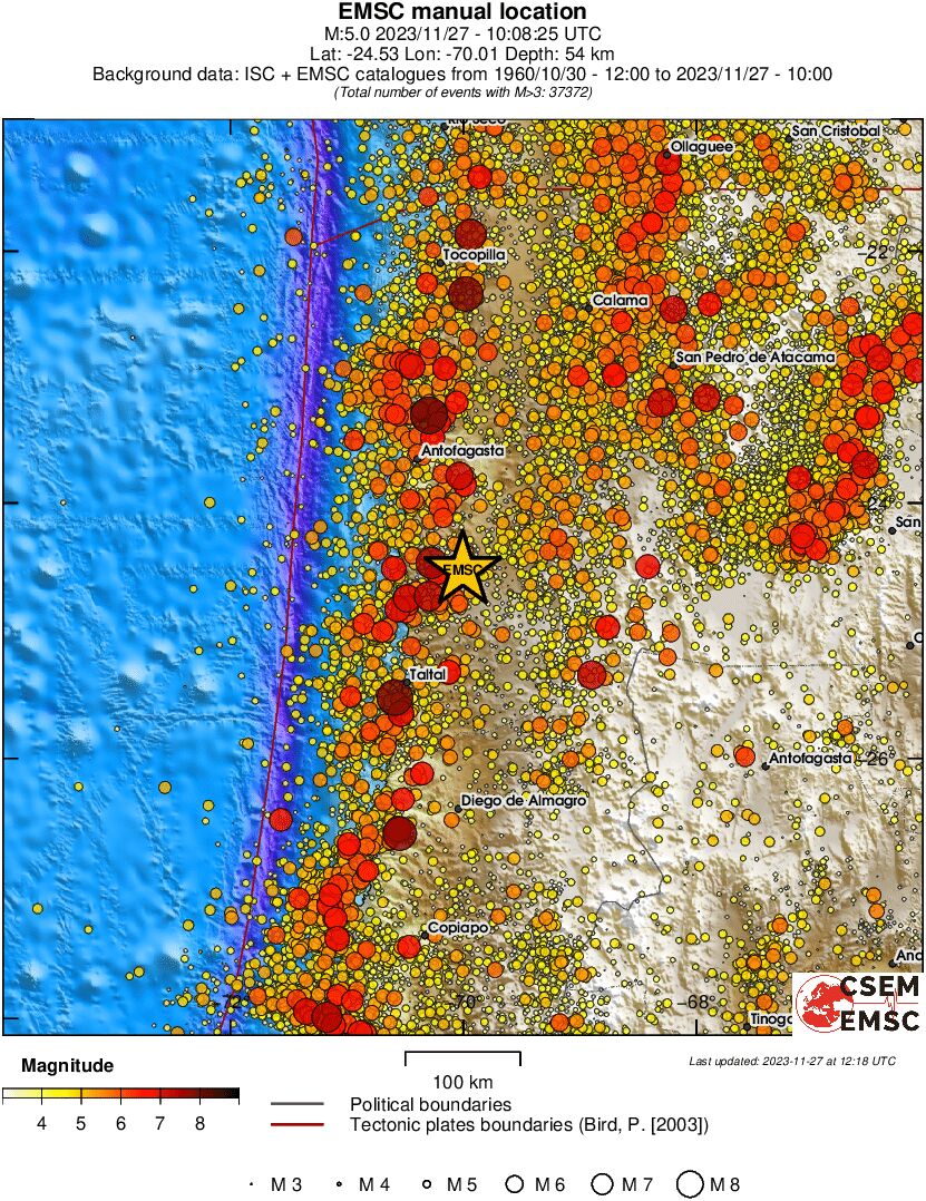 Землетрясение в Antofagasta, Chile магнитудой 5.0 произошло 27 ноября 2023 года. Согласно данным Геологической службы Соединенных Штатов (USGS), подземные толчки произошли в 10:08 UTC (13:08 МСК). Очаг землетрясения находился на глубине 61.1 км.