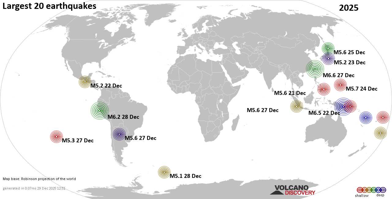 Землетрясения сегодня на карте: сильные землетрясения, 29 декабря 2025 года