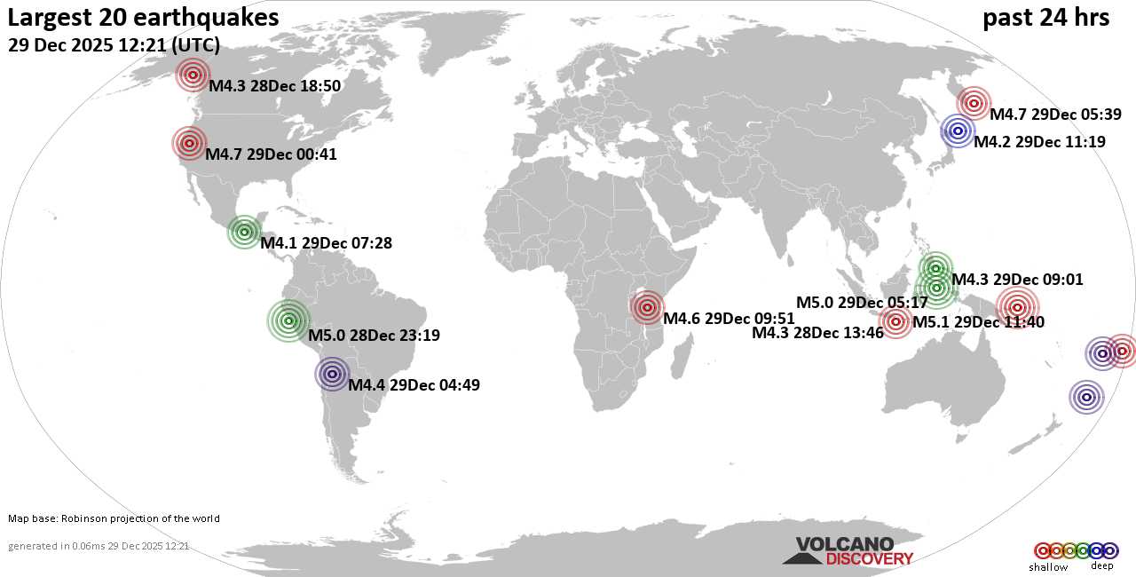 Землетрясения сегодня на карте: последние сильные землетрясения, 29 декабря 2025 года