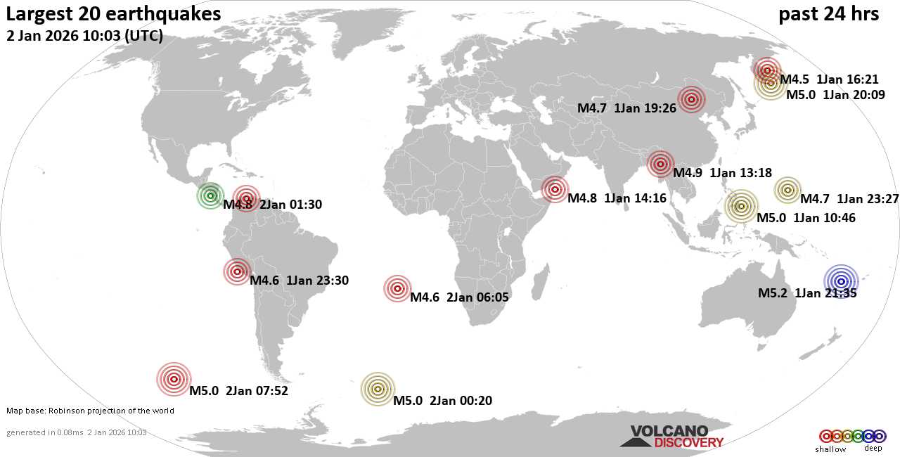 На карте сильные землетрясения за последние 24 часа, 2 января 2026 года