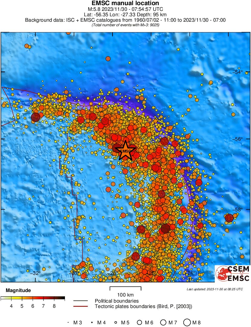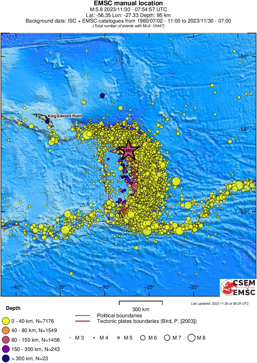 Землетрясение в South Sandwich Islands region магнитудой 5.8 произошло 30 ноября 2023 года. Согласно данным Геологической службы Соединенных Штатов (USGS), подземные толчки произошли в 07:54 UTC (10:54 МСК). Очаг землетрясения находился на глубине 98.6 км.