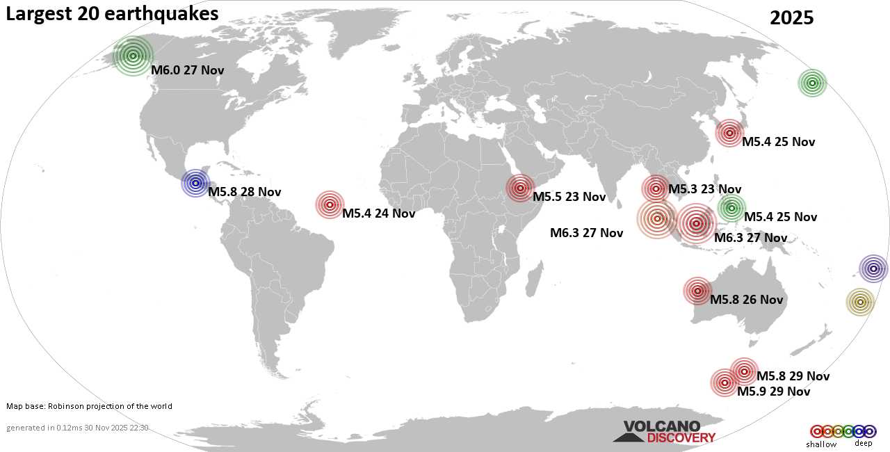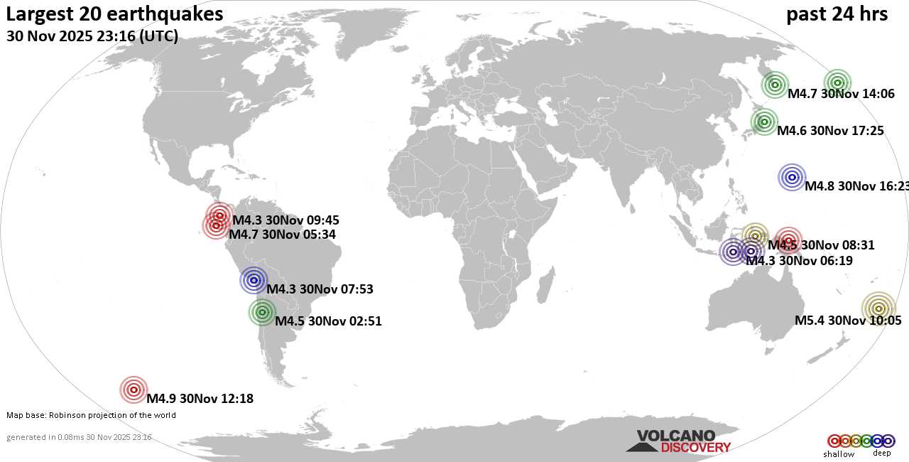 Землетрясения вчера на карте: сильные землетрясения, 30 ноября 2025 года