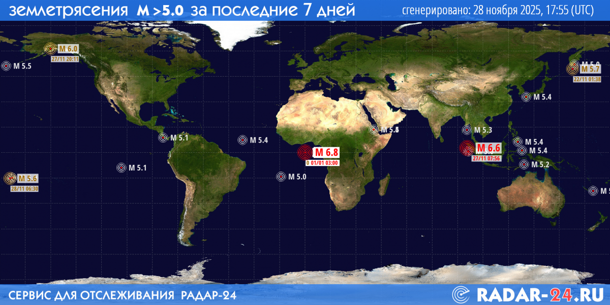Землетрясения сегодня на карте: сильные землетрясения, 28 ноября 2025 года