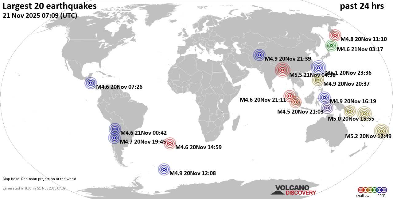 Землетрясения вчера на карте: сильные землетрясения, 20 ноября 2025 года
