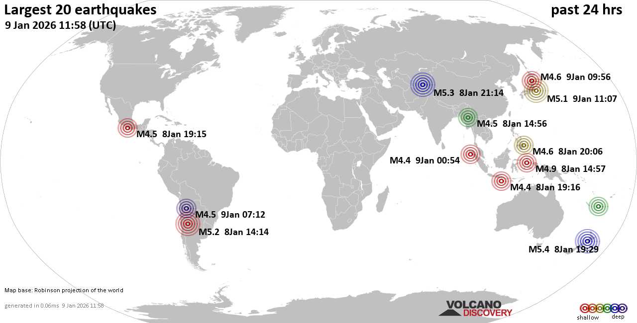 На карте сильные землетрясения за последние 24 часа, 8 января 2026 года