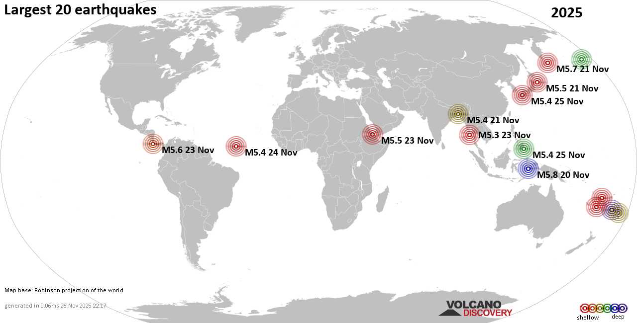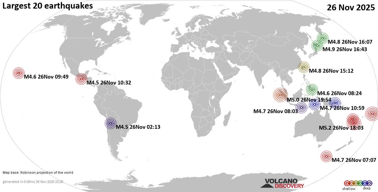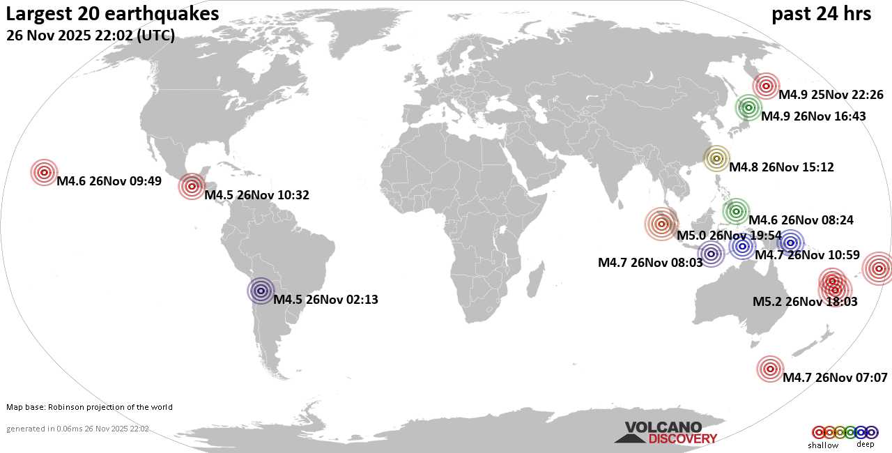 Землетрясения вчера на карте: сильные землетрясения, 26 ноября 2025 года