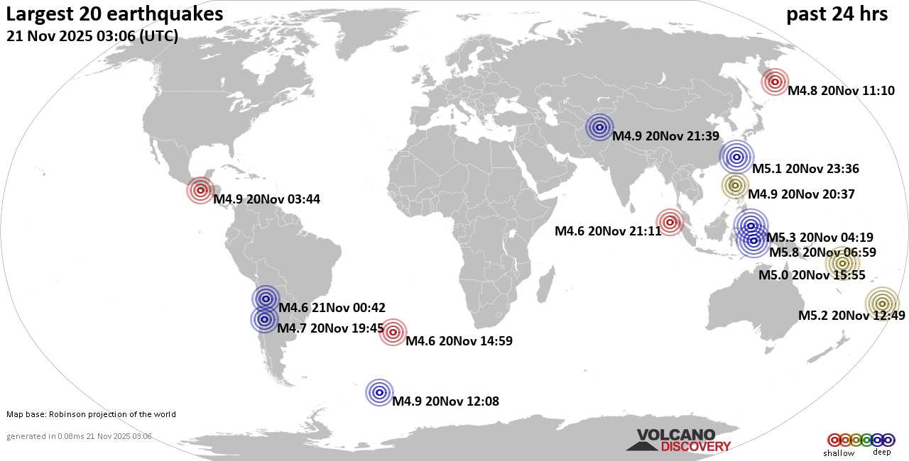 Землетрясения вчера на карте: сильные землетрясения, 20 ноября 2025 года