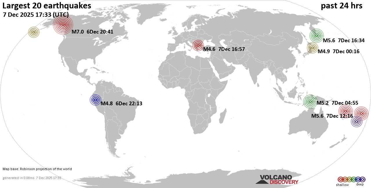 На карте сильные землетрясения за последние 24 часа, 7 декабря 2025 года