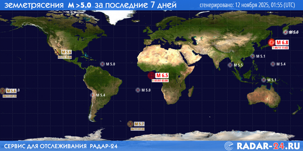 На карте сильные землетрясения за последние 24 часа, 11 ноября 2025 года