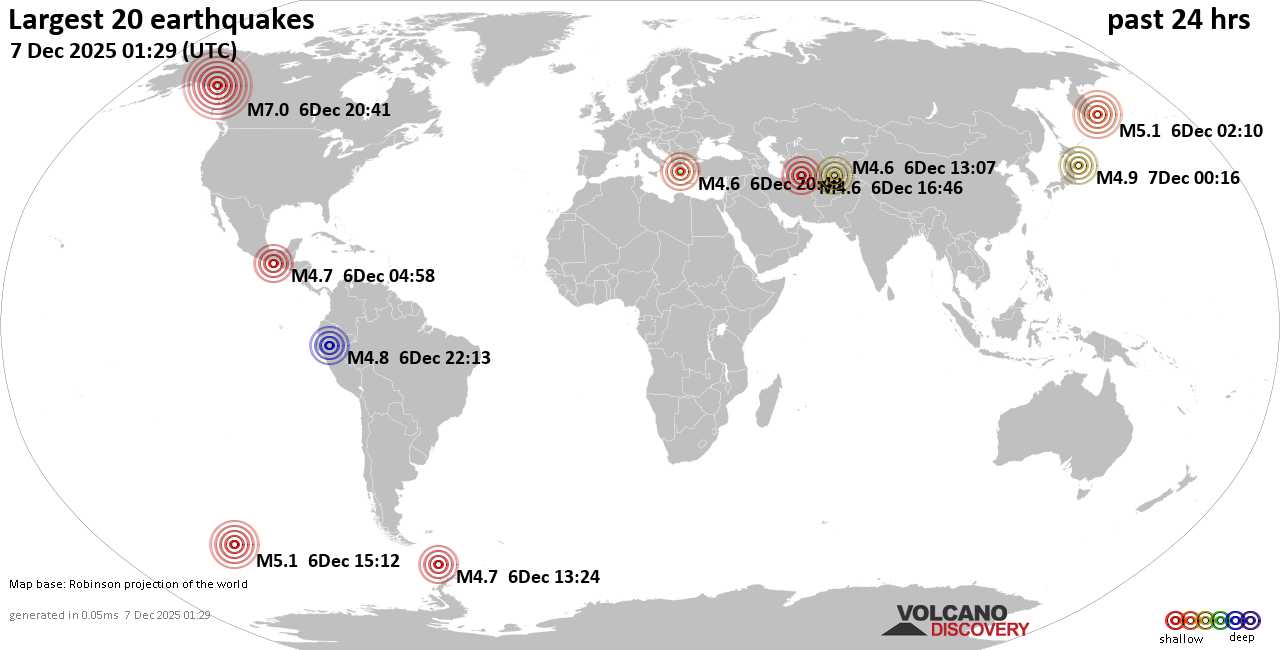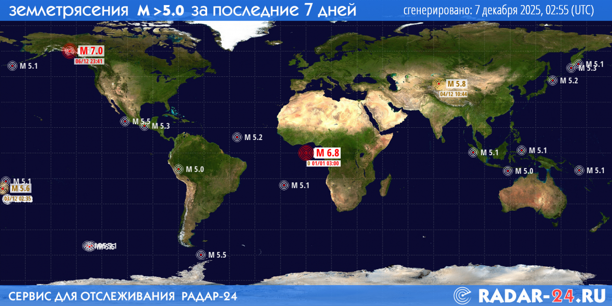 На карте сильные землетрясения за последние 24 часа, 7 декабря 2025 года