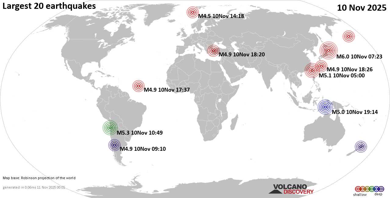 Землетрясения вчера на карте: сильные землетрясения, 10 ноября 2025 года