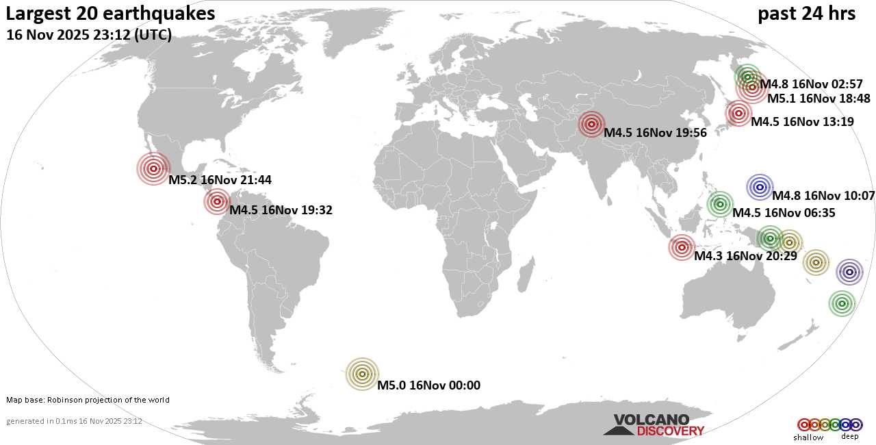 Землетрясения вчера на карте: сильные землетрясения, 16 ноября 2025 года