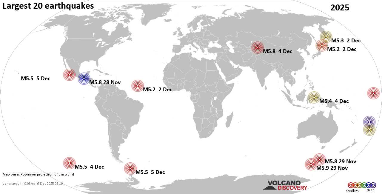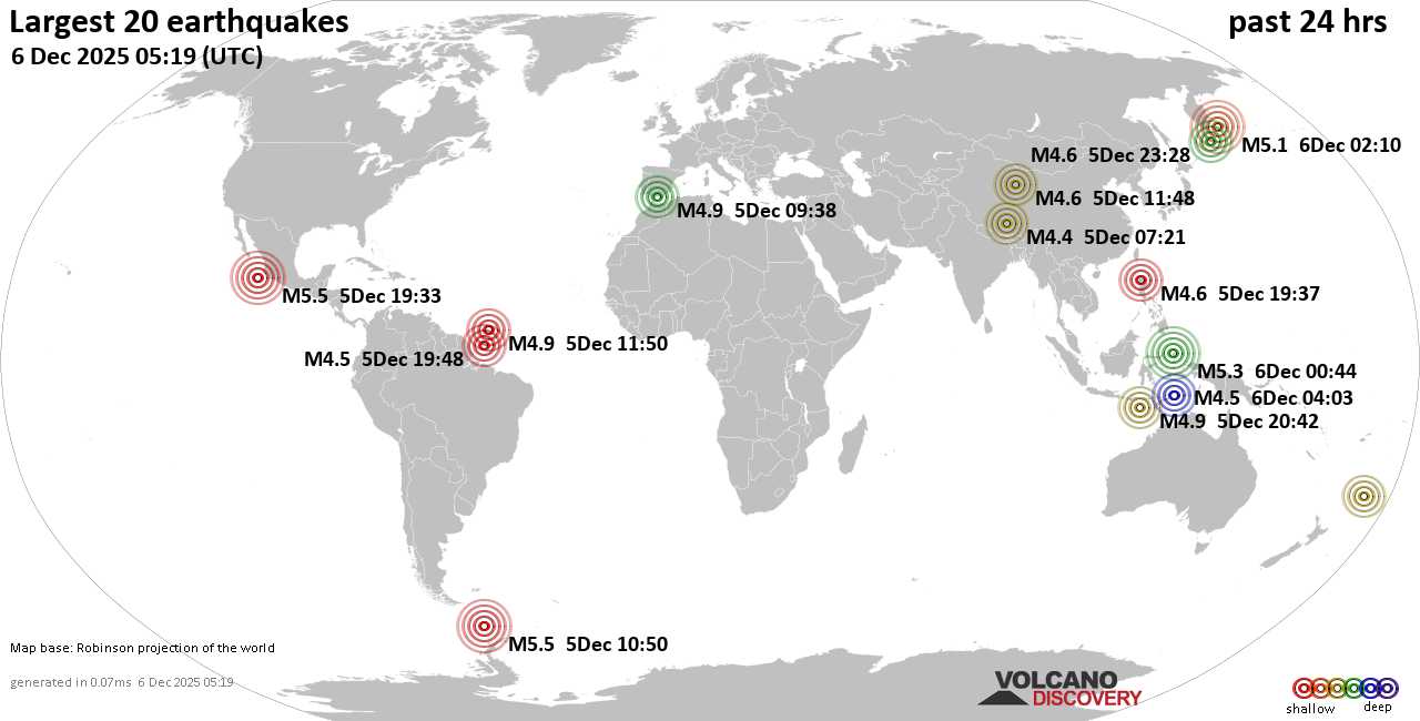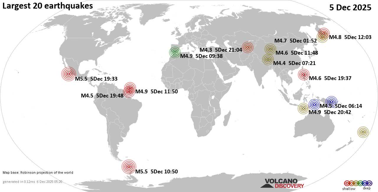 Землетрясения вчера на карте: сильные землетрясения, 5 декабря 2025 года