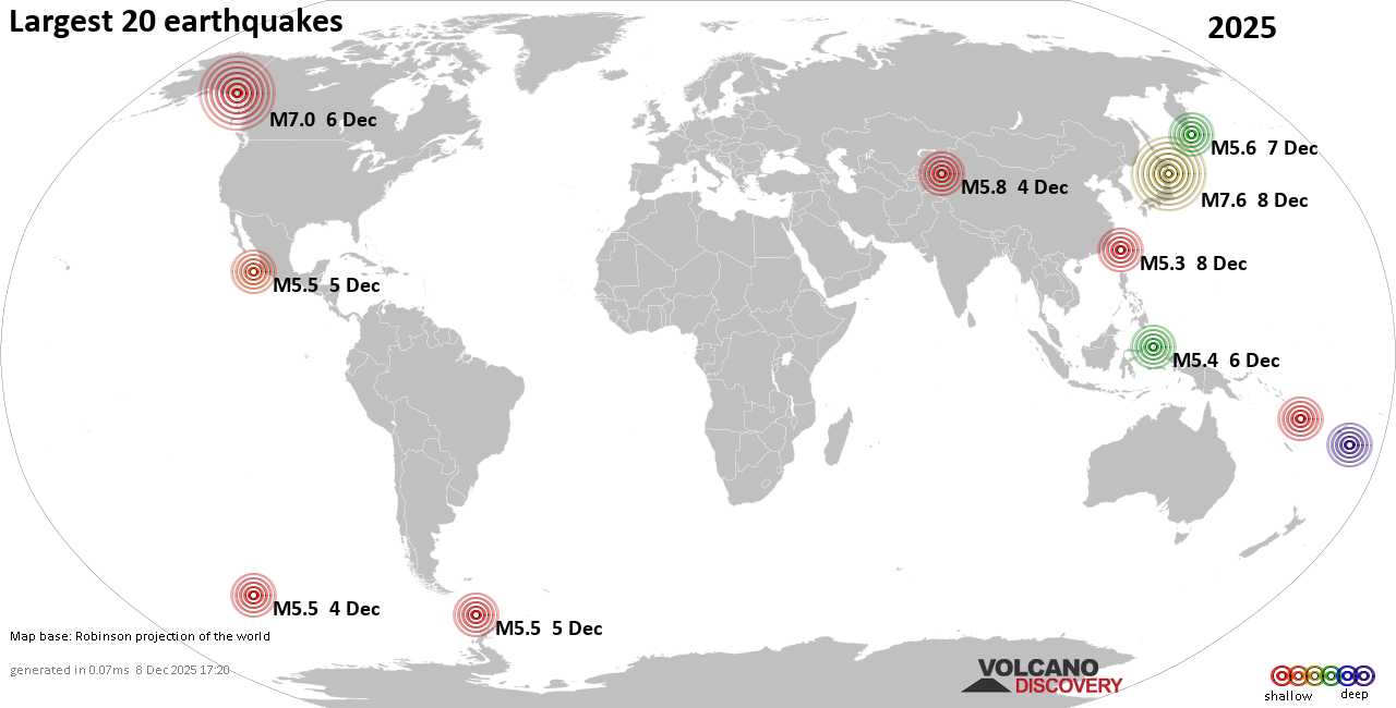 Землетрясения сегодня на карте: последние сильные землетрясения, 8 декабря 2025 года