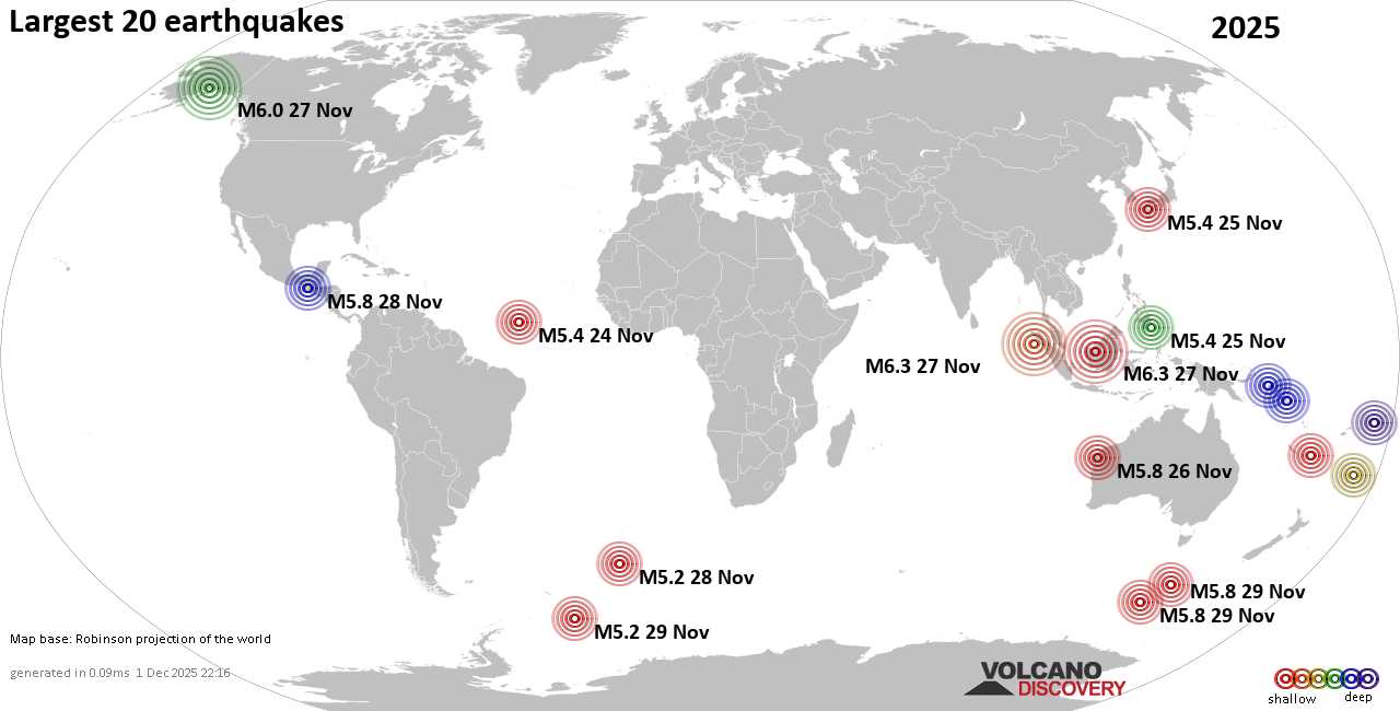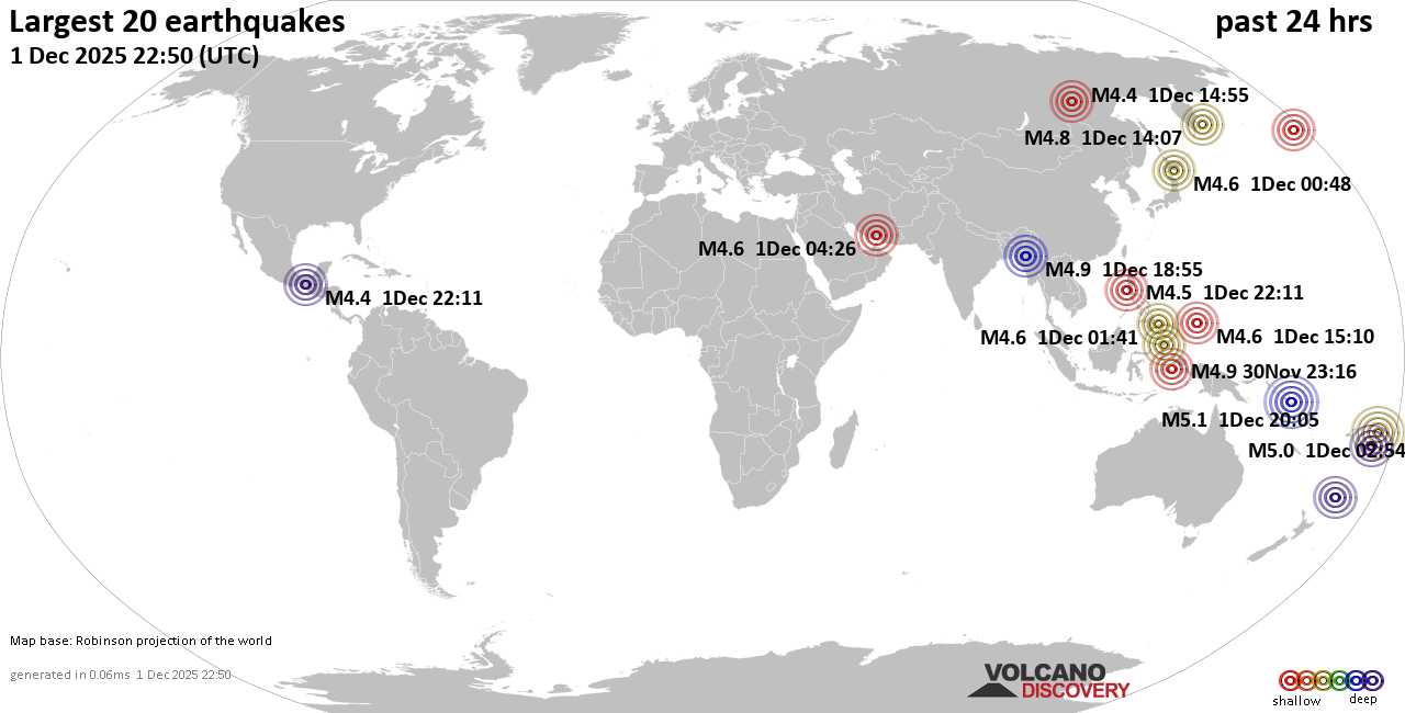 Землетрясения вчера на карте: сильные землетрясения, 1 декабря 2025 года