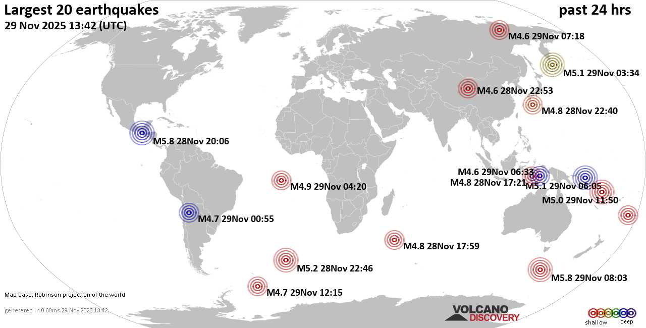 На карте сильные землетрясения за последние 24 часа, 29 ноября 2025 года