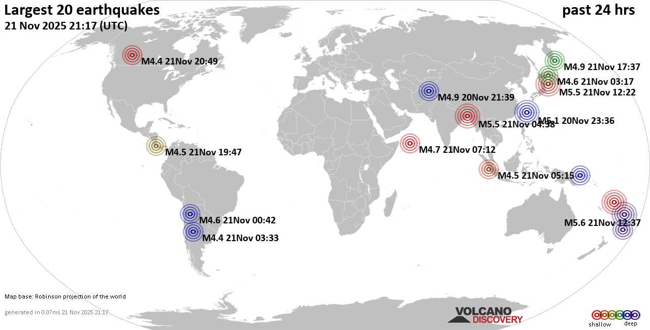 Землетрясения вчера на карте: сильные землетрясения, 21 ноября 2025 года