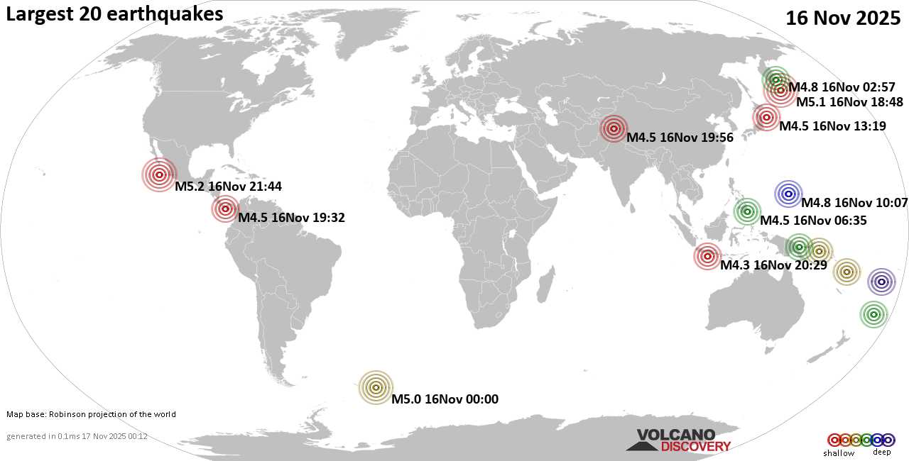 Землетрясения вчера на карте: сильные землетрясения, 16 ноября 2025 года