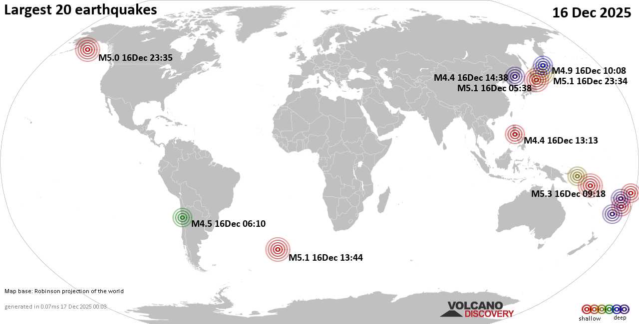Землетрясения вчера на карте: сильные землетрясения, 16 декабря 2025 года