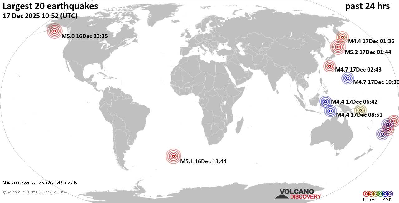 На карте сильные землетрясения за последние 24 часа, 17 декабря 2025 года