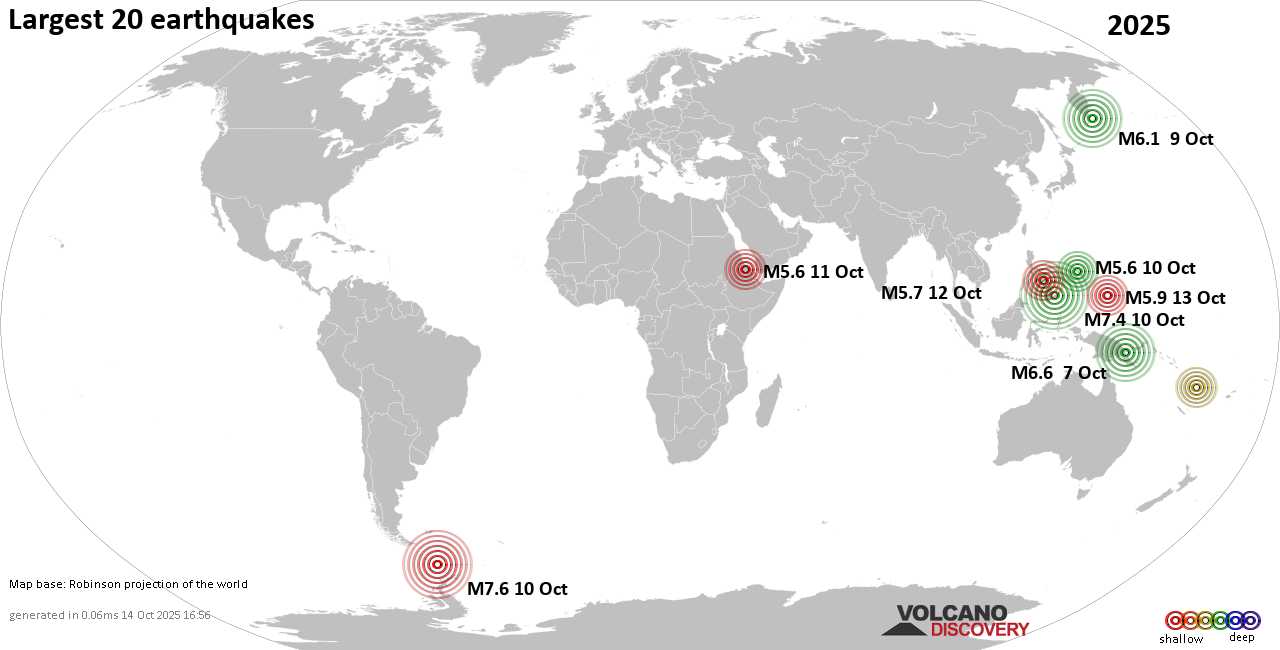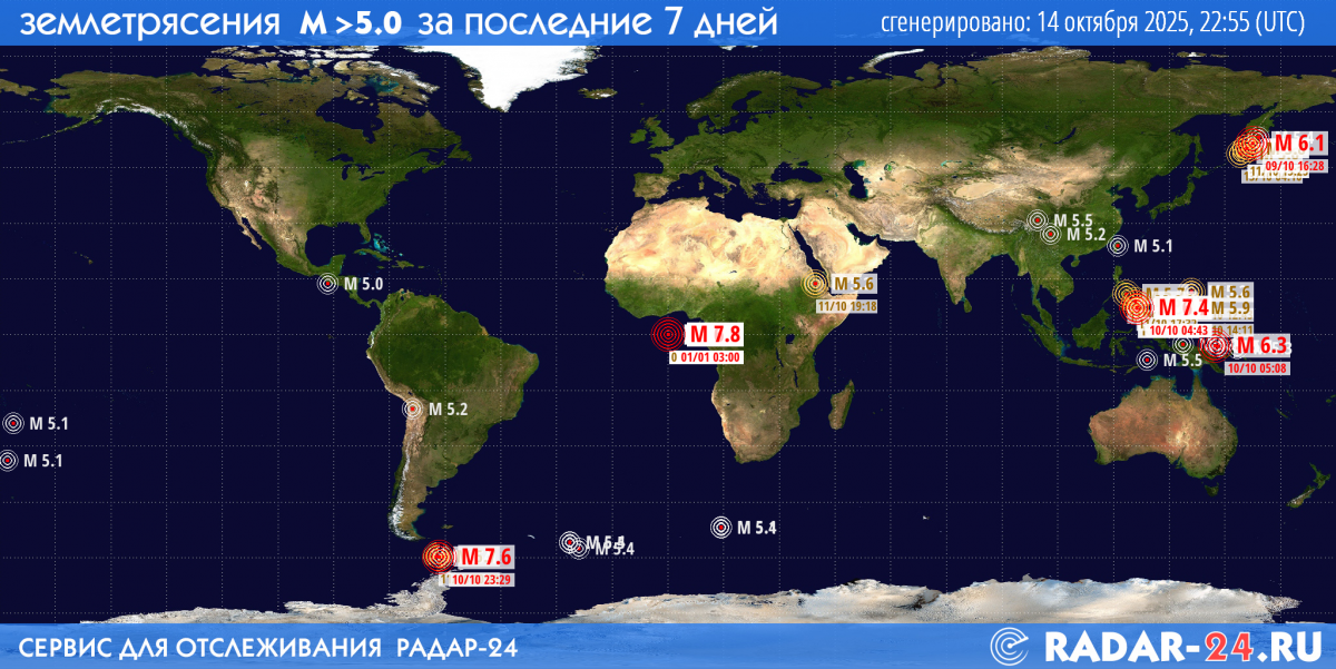 Землетрясения сегодня на карте: сильные землетрясения, 14 октября 2025 года