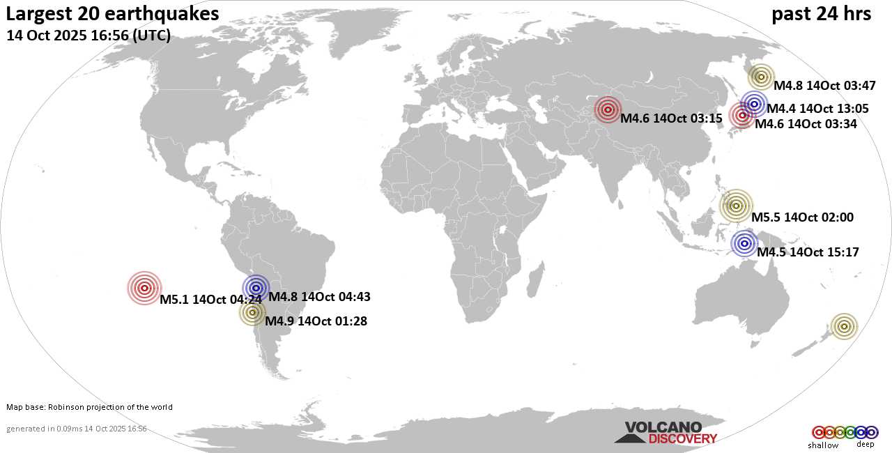 Землетрясения сегодня на карте: последние сильные землетрясения, 14 октября 2025 года