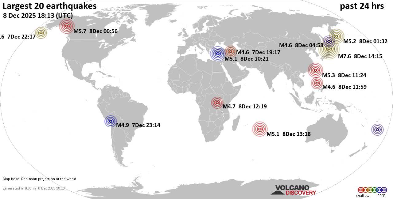 Землетрясения сегодня на карте: последние сильные землетрясения, 8 декабря 2025 года