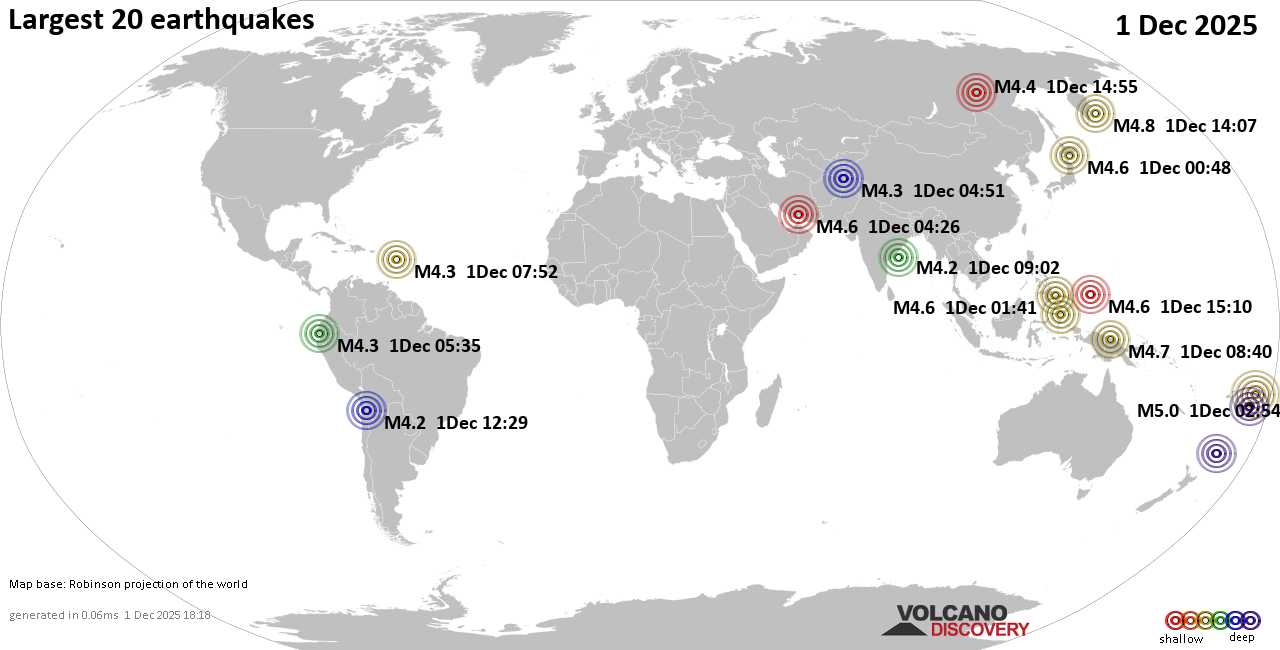 Землетрясения сегодня на карте: последние сильные землетрясения, 1 декабря 2025 года