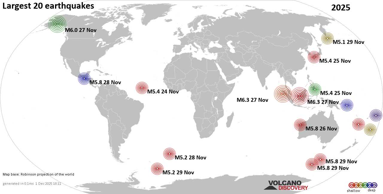 Землетрясения вчера на карте: сильные землетрясения, 30 ноября 2025 года