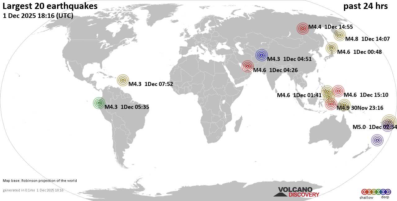На карте сильные землетрясения за последние 24 часа, 1 декабря 2025 года