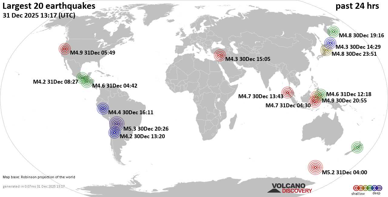 На карте сильные землетрясения за последние 24 часа, 31 декабря 2025 года