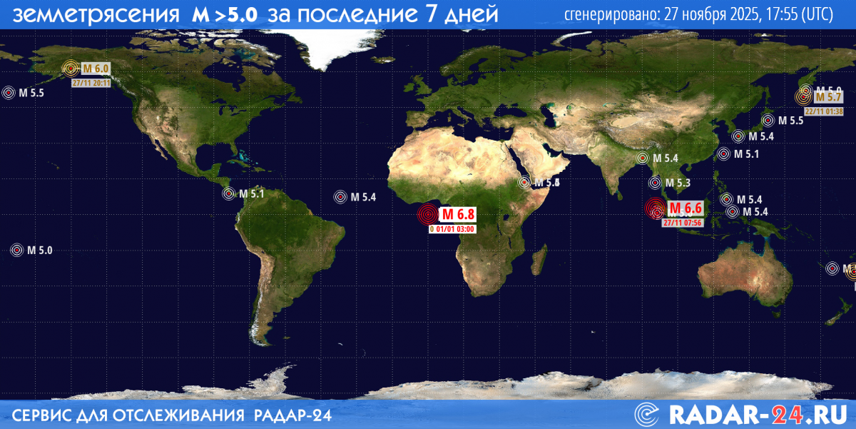Список последних произошедших землетрясений сегодня, 27 ноября 2025