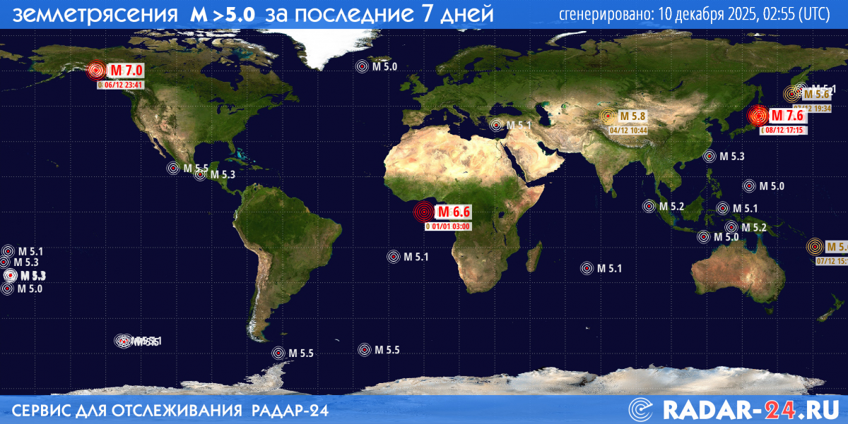 Список последних произошедших землетрясений сегодня, 9 декабря 2025